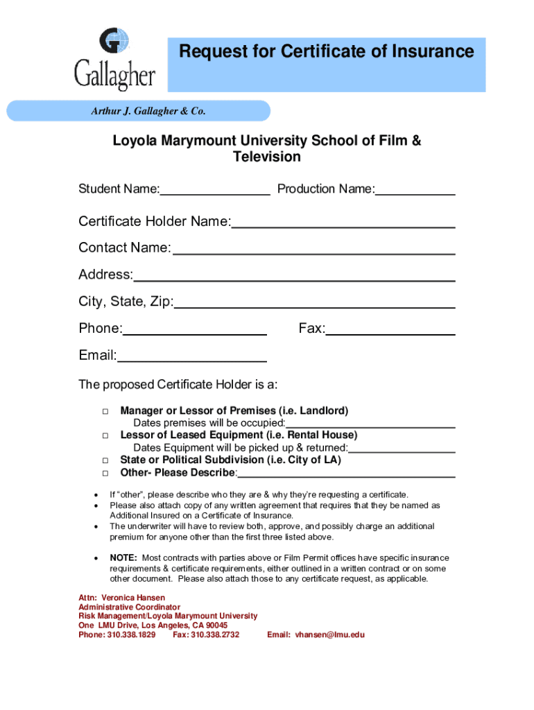 Request for Certificate of Insurance Arthur J. Gallagher & Co. Loyola Mary mount University School of Film & Television Student Name:Production Name:Certificate Holder Name: Contact Name: Address: