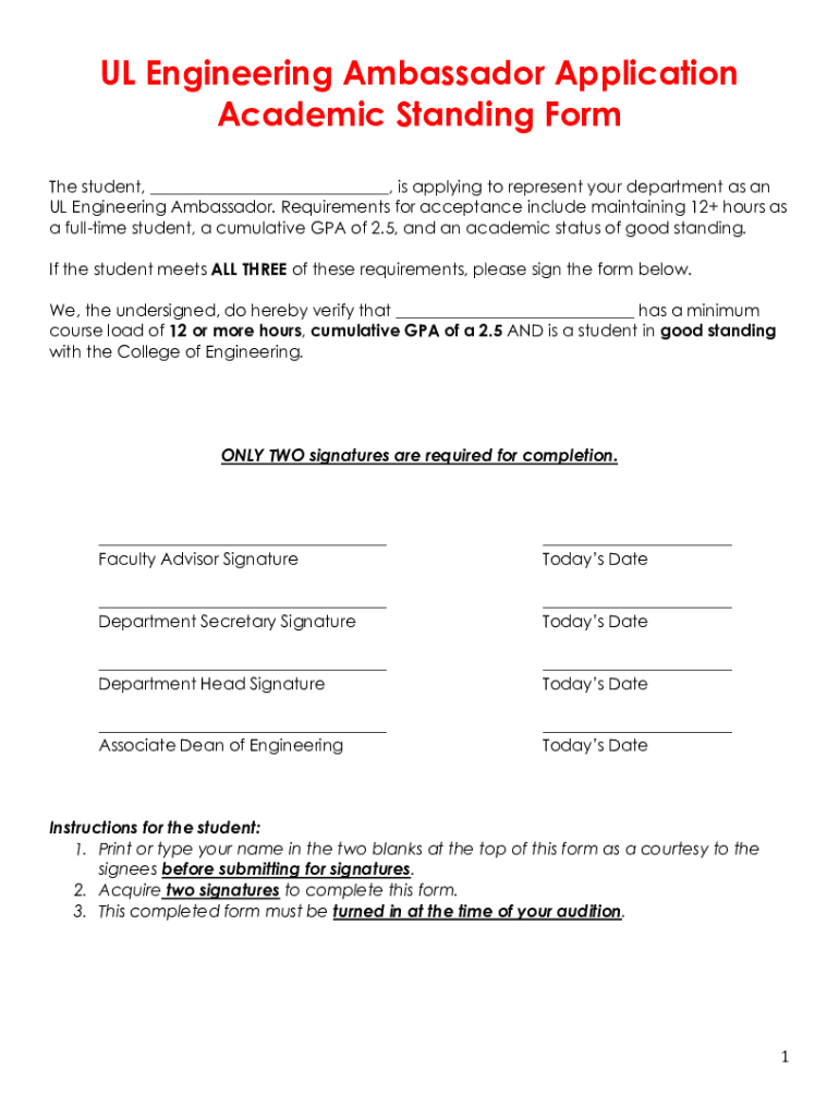 UL Engineering Ambassador Application Academic Standing Form The student, is applying to represent your department as an UL Engineering Ambassador. Requirements for acceptance include maintaining