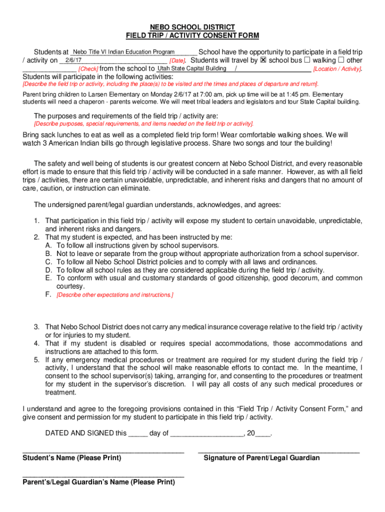 Get the free NEBO SCHOOL DISTRICT FIELD TRIP / ACTIVITY CONSENT FORM