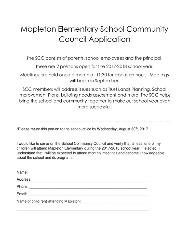 Mapleton Elementary School Community Council Application The SCC consists of parents, school employees and the principal. There are 2 positions open for the 20172018 school year. Meetings are held
