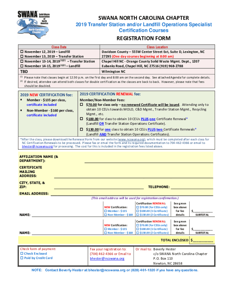 SWAN NORTH CAROLINA CHAPTER 2019 Transfer Station and/or Landfill Operations Specialist Certification CoursesREGISTRATION FORM Class Date November 12, 2019, Landfill November 13, 2019, Transfer Station