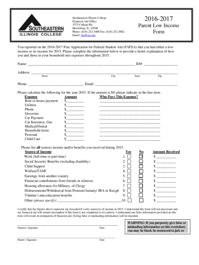 20162017Southeastern Illinois College Financial Aid Office 3575 College Rd. Harrisburg, IL 62946 Phone: (618) 2525400 Fax: (618) 2523062 Email: FAO sic. Apparent Low Income Form reported on the 20162017