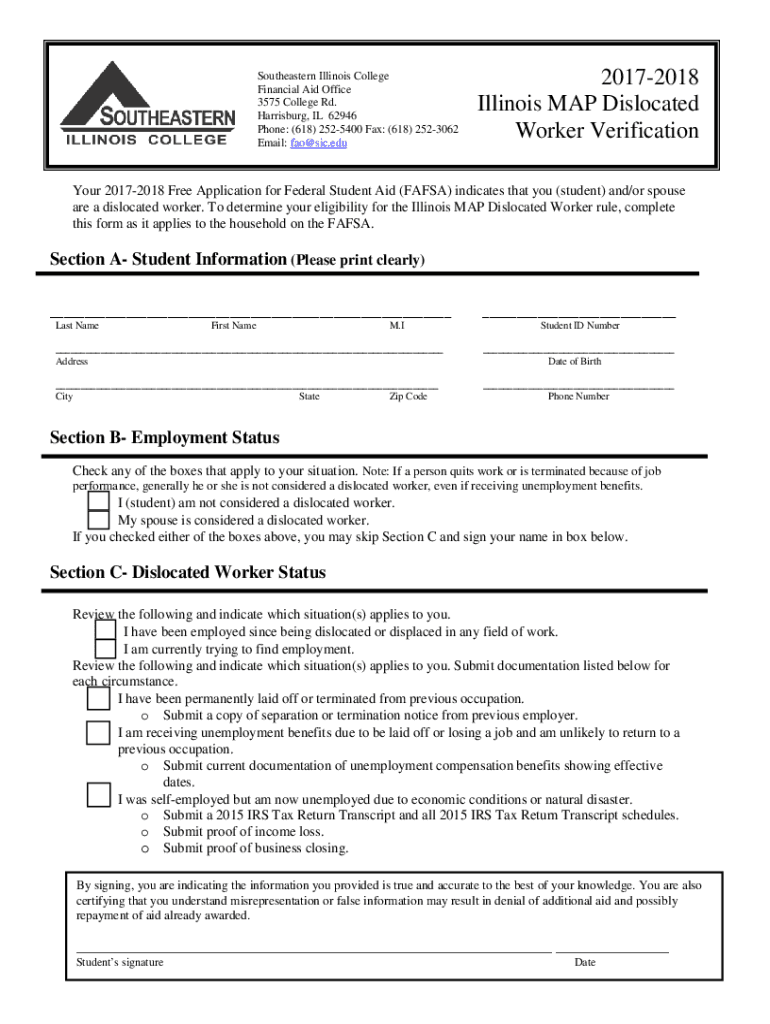 The Illinois MAP Dislocated Worker Form is a crucial document that helps students and the spouses of dislocated workers assess their eligibility for financial aid under the Illinois MAP Dislocated Worker rule. This form serves as an integral part of the application for financial assistance, enabling those affected by workforce changes to seek necessary support for their education.