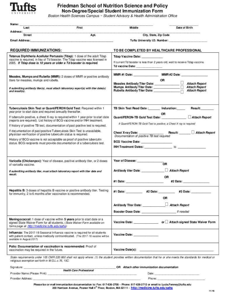 Friedman School of Nutrition Science and Policy NonDegree/Special Student Immunization Form Boston Health Sciences Campus Student Advisory & Health Administration Office Name: Last First Middle Date