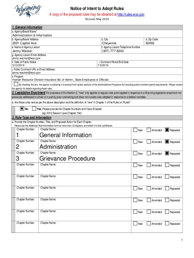 Notice of Intent to Adopt Rules A copy of the proposed rules may be obtained at http://rules.wyo.gov RevisedMay2018 1. General Information a. Agency/Board Name×Administration & Information b. Agency/Board