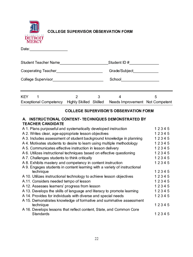 COLLEGE SUPERVISOR OBSERVATION Format: Student Teacher Name Student ID # Cooperating Teacher Grade/Subject College Supervisor School KEY 1 Exceptional Competency4 5 Needs Improvement Not Competent2