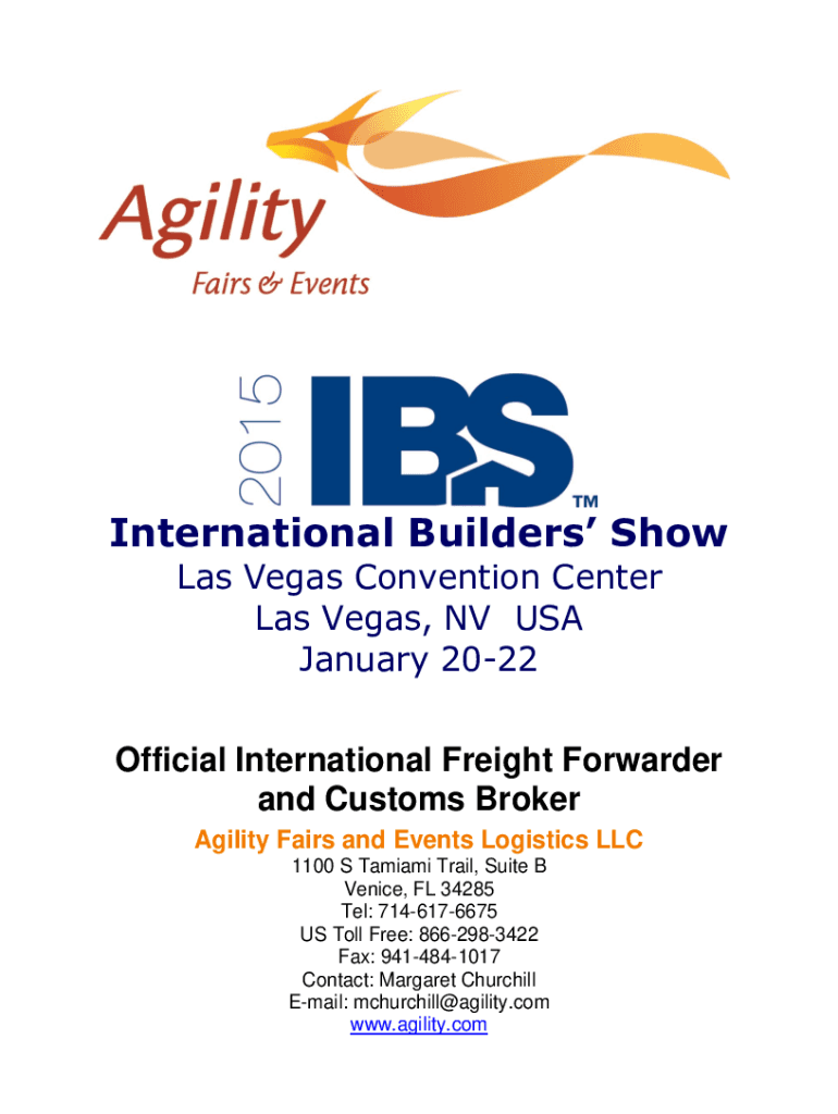 International Builders Show Las Vegas Convention Center Las Vegas, NV USA January 2022 Official International Freight Forwarder and Customs Broker Agility Fairs and Events Logistics LLC 1100 S Tamiami