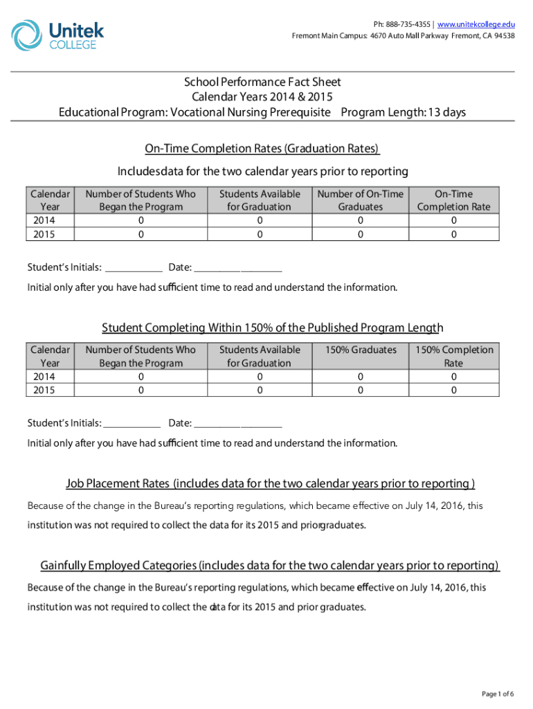 PH: 8887354355 www.unitekcollege.edu Fremont Main Campus: 4670 Auto Mall Parkway Fremont, CA 94538School Performance Fact Sheet Calendar Years 2014 & 2015 Educational Program: Vocational Nursing Prerequisite