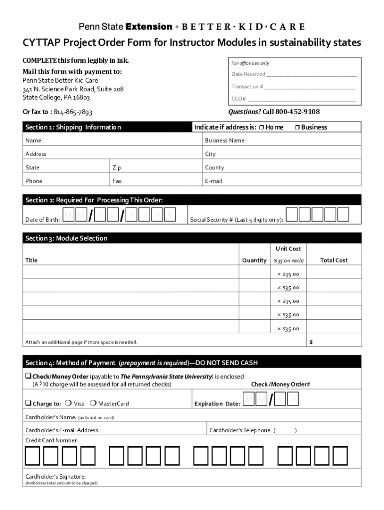 CYT TAP Project Order Form for Instructor Modules in sustainability states COMPLETE this form legibly in ink. For office use Olympic this form with payment to: Penn State Better Kid Care 341 N. Science