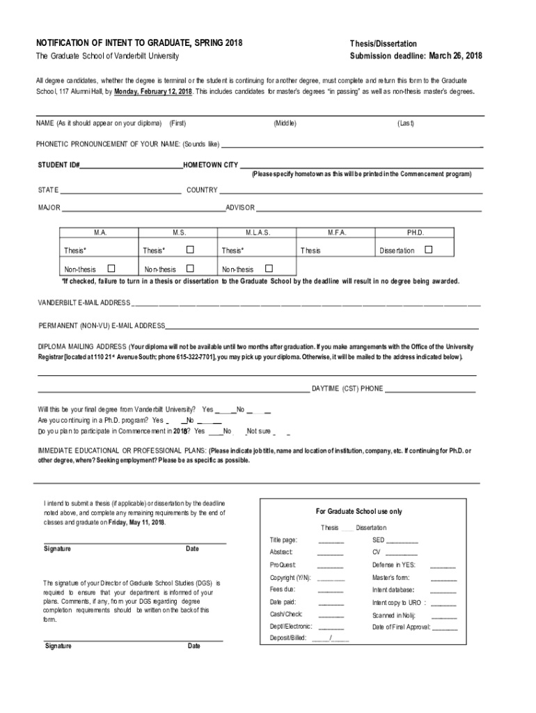 Get the free NOTIFICATION OF INTENT TO GRADUATE, SPRING 2018 - gradschool vanderbilt