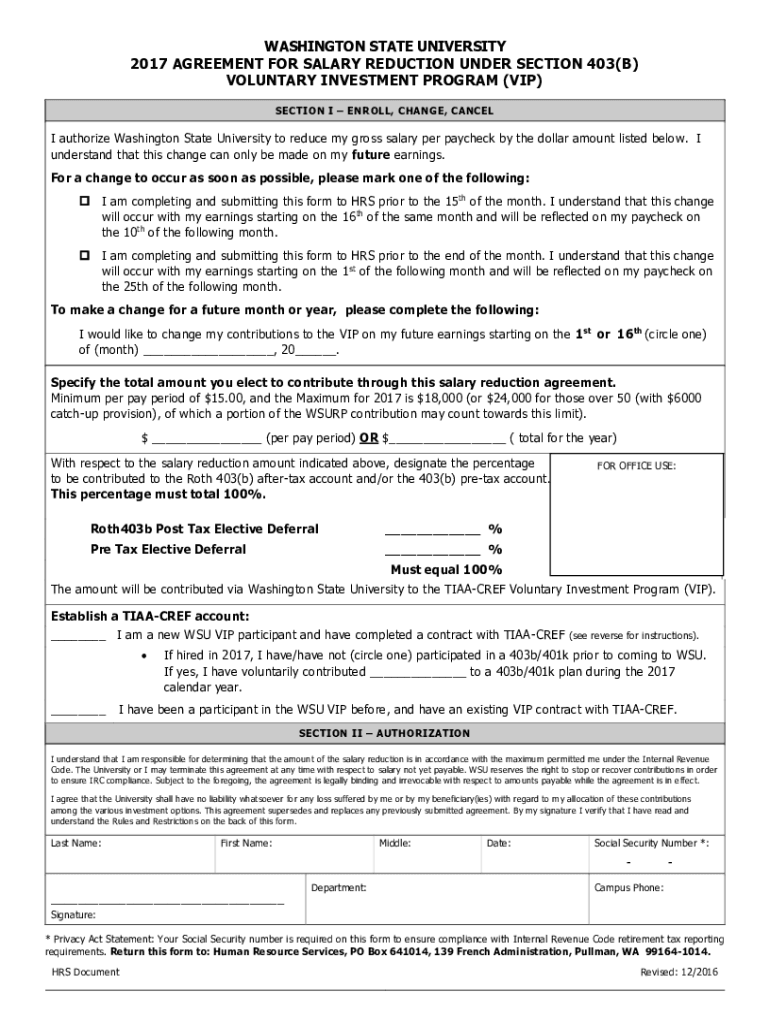 WASHINGTON STATE UNIVERSITY 2017 AGREEMENT FOR SALARY REDUCTION UNDER SECTION 403(B) VOLUNTARY INVESTMENT PROGRAM (VIP) SECTION I ENROLL, CHANGE, CANCEL authorize Washington State University to reduce