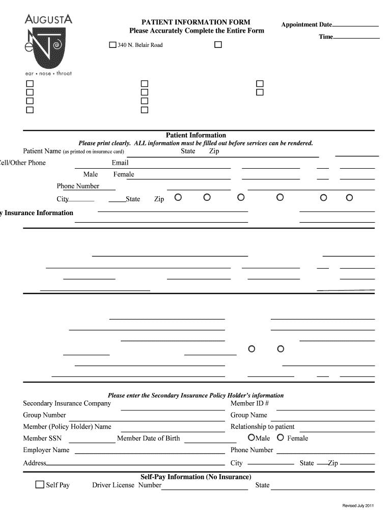 The Patient Information Form is a critical component in the patient registration process at Augusta ENT, PC. This form collects essential details such as personal demographics, medical history, and insurance information. By accurately completing the form, patients ensure they receive quality healthcare and their insurance claims are processed efficiently.
