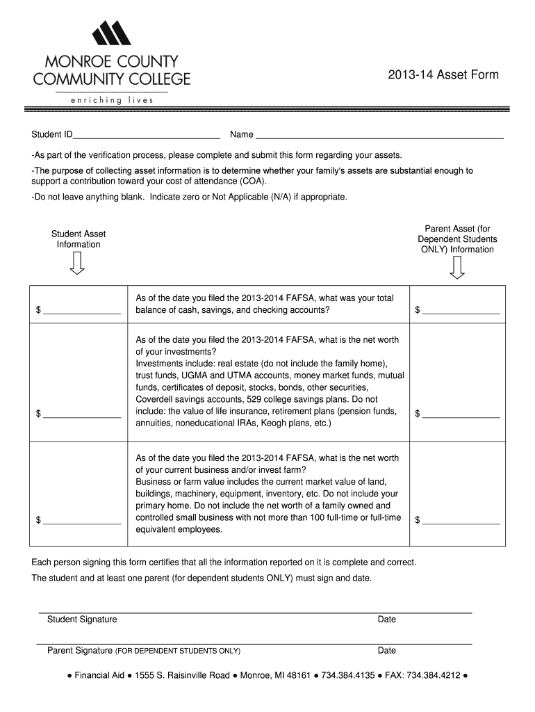 The 2013-14 Student Asset Verification Form is a financial aid application form used by students to provide asset information for determining financial aid eligibility.