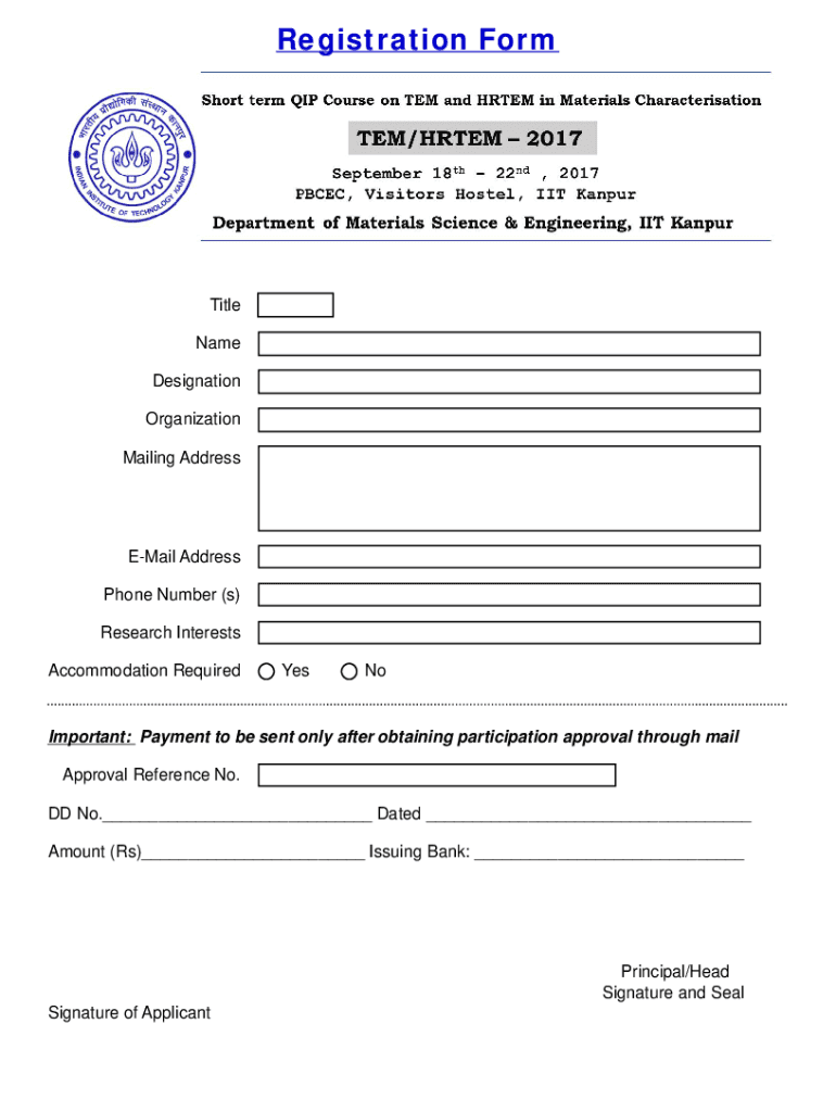 Registration Fertile Name Designation Organization Mailing AddressEMail Address Phone Number (s) Research Interests Accommodation RequiredYesNoImportant: Payment to be sent only after obtaining participation