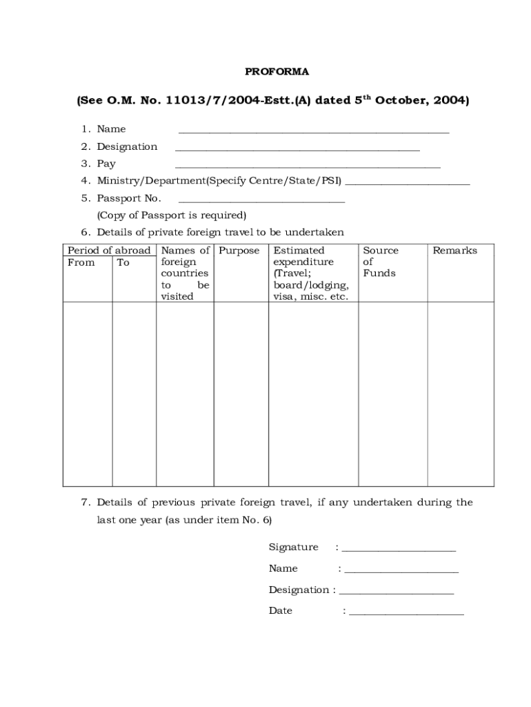 PROFORMA(See O.M. No. 11013/7/2004Estt.(A) dated 5th October 2004) 1. Name 2. Designation 3. Pay 4. Ministry/Department(Specify Center/State/PSI) 5. Passport No. (Copy of Passport is required) 6.