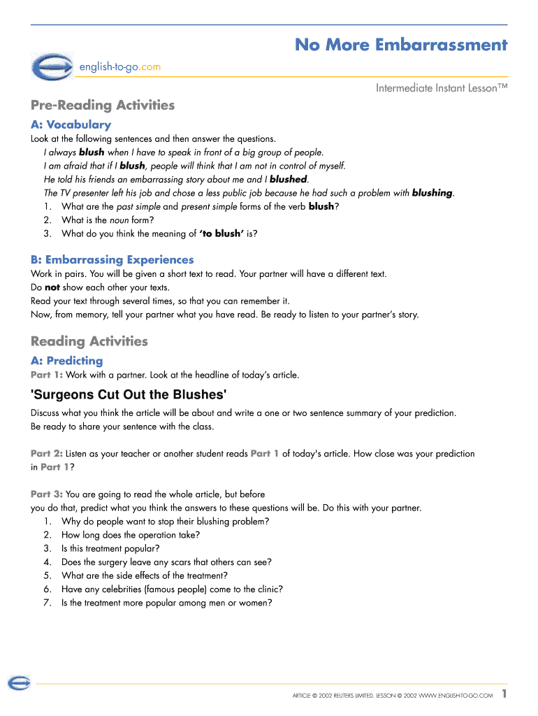 No More Embarrassment englishtogo.com Intermediate Instant Lesson Rereading Activities A: Vocabulary Look at the following sentences and then answer the questions. I always blush when I have to speak