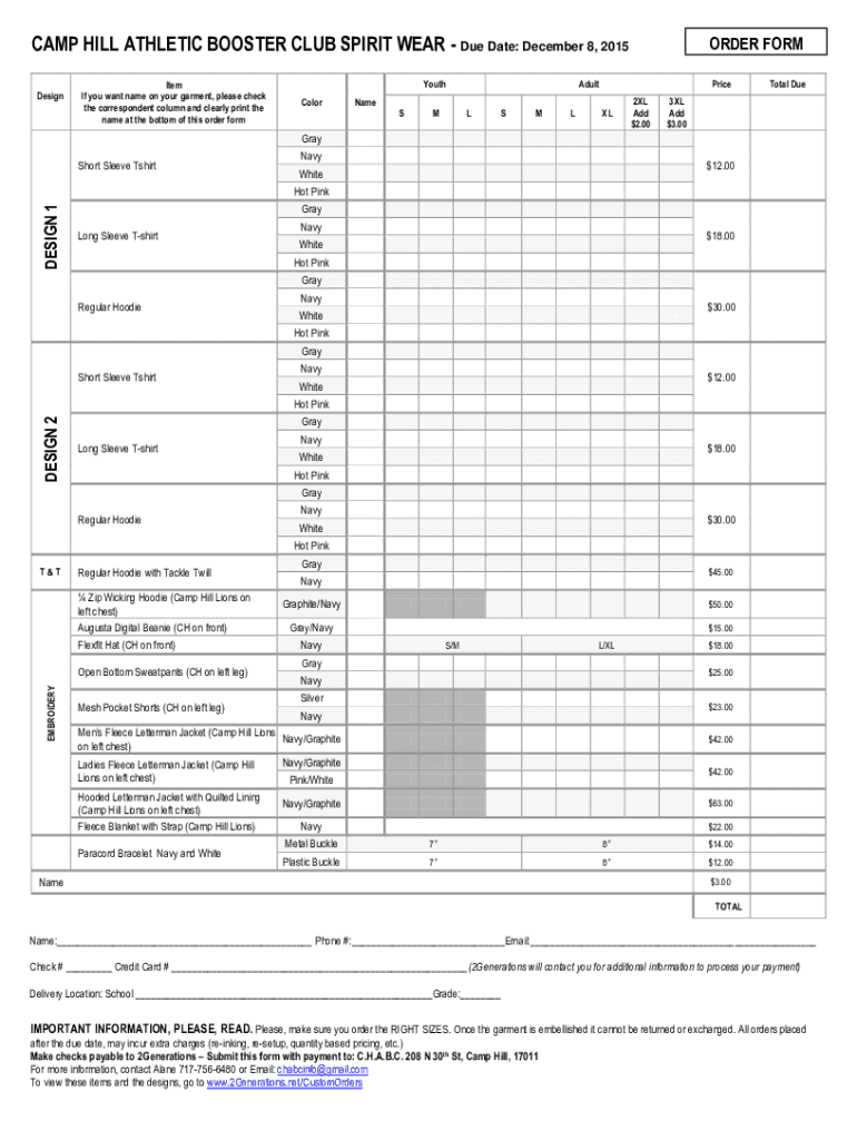 CAMP HILL ATHLETIC BOOSTER CLUB SPIRIT WEAR Due Date: December 8, 2015, Designated If you want name on your garment, please check the correspondent column and clearly print the name at the bottom