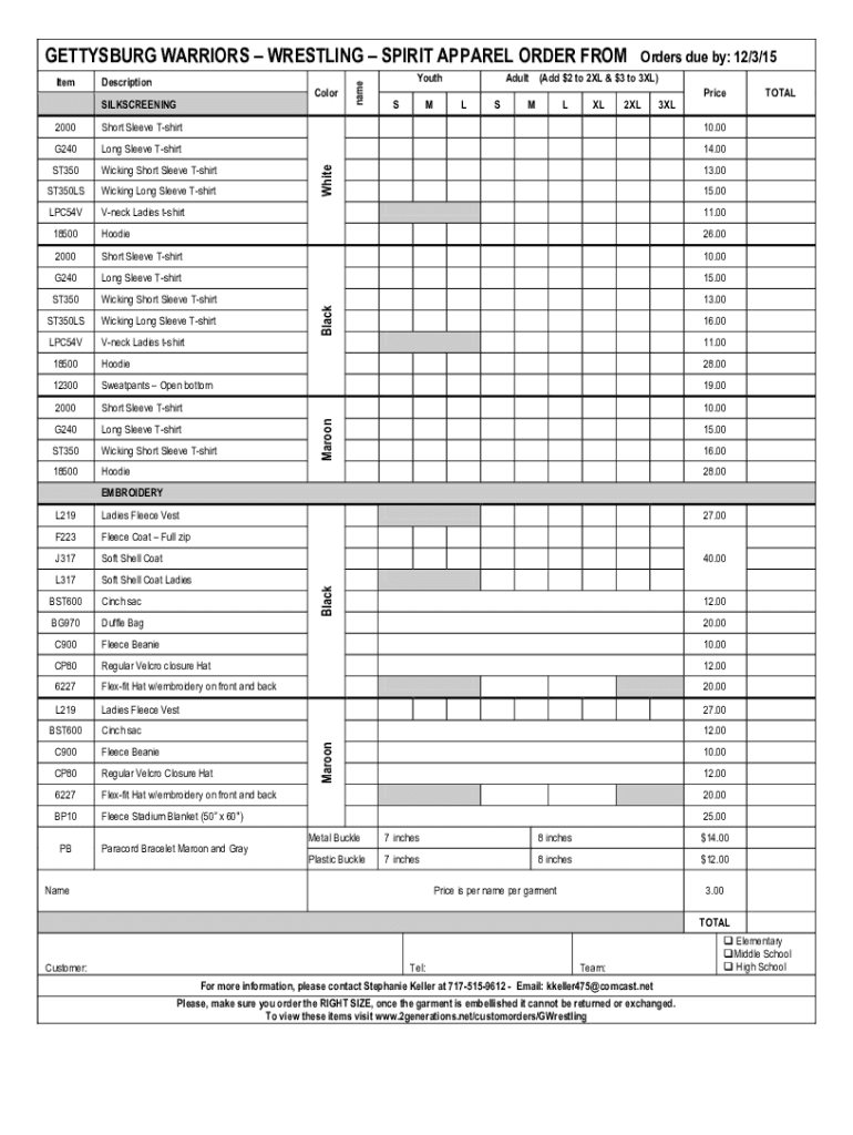 ItemDescriptionColorSILKSCREENINGnameGETTYSBURG WARRIORS WRESTLING SPIRIT APPAREL ORDER FROM Youth Smolders due by: 12/3/15Adult (Add $2 to 2XL & $3 to 3XL) LSMLXL2XL3XLPriceShort Sleeve Tshirt10.00G240Long