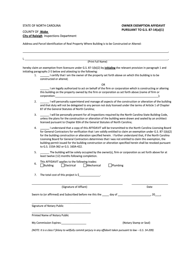 The North Carolina Owner Exemption Affidavit is a legal document used by property owners in North Carolina to claim an exemption from licensure when constructing or altering a building.