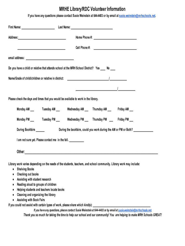 MRHELibrary/RDCVolunteerInformation IfyouhaveanyquestionspleasecontactSusieWeinsteinat6444403orbyemailatsusie. Weinstein's preschools.net. Filename: Hostname: Address: Homophone#: Cellphone#: email