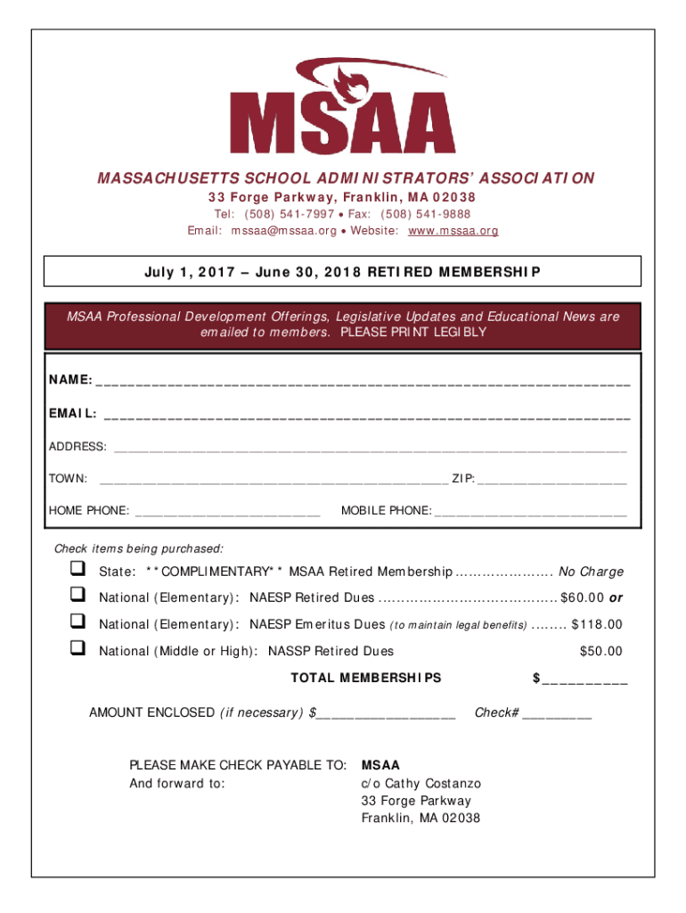 MASSACHUSETTS SCHOOL ADMINISTRATORS ASSOCIATION 33 Forge Parkway, Franklin, MA 02038 Tel: (508) 5417997 Fax: (508) 5419888 Email: MSSA.org Website: www.mssaa.orgJuly 1, 2017 June 30, 2018, RETIRED