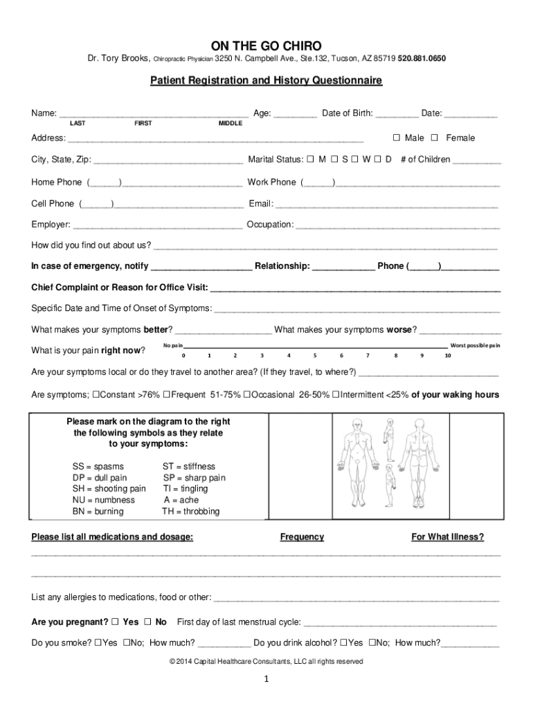 ON THE GO CAIRO Dr. Tory Brooks, Chiropractic Physician 3250 N. Campbell Ave., Ste.132, Tucson, AZ 85719 520.881.0650Patient Registration and History Questionnaire Name: Age: Date of Birth: Date: