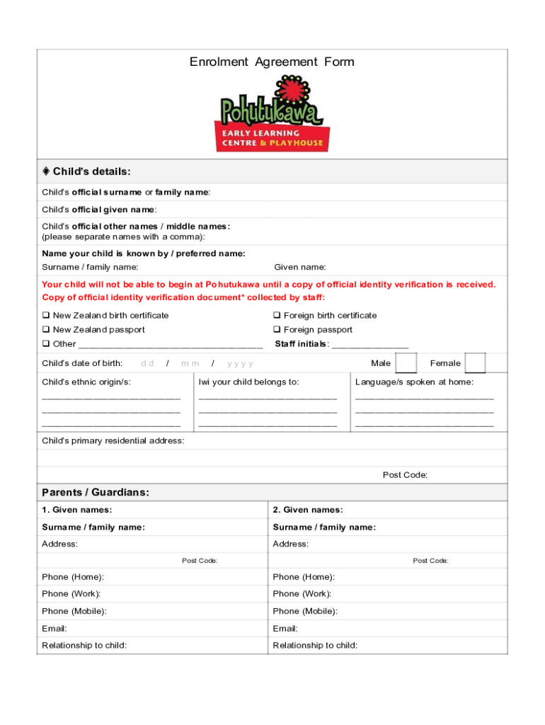 Enrollment Agreement Form Child's details: Child's official surname or family name: Child's official given name: Child's official other names / middle names: (please separate names with a comma):