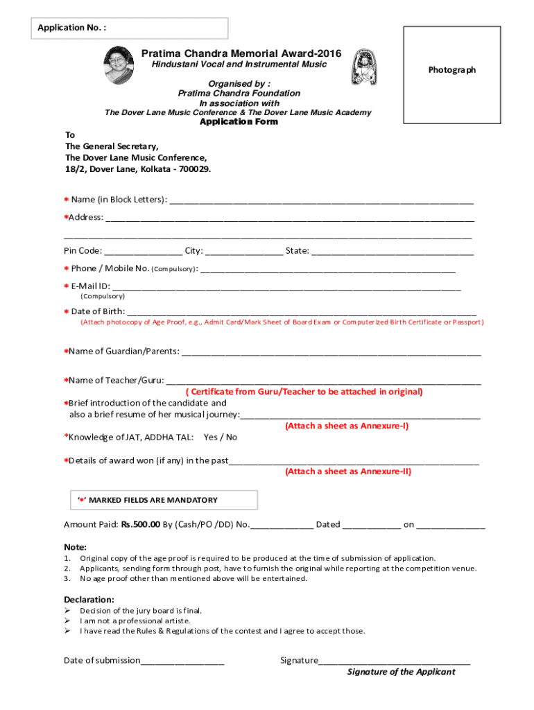 Application No. Fatima Chandra Memorial Award2016 Hindustani Vocal and Instrumental MusicPhotographOrganised by : Fatima Chandra Foundation In association with The Dover Lane Music Conference & The