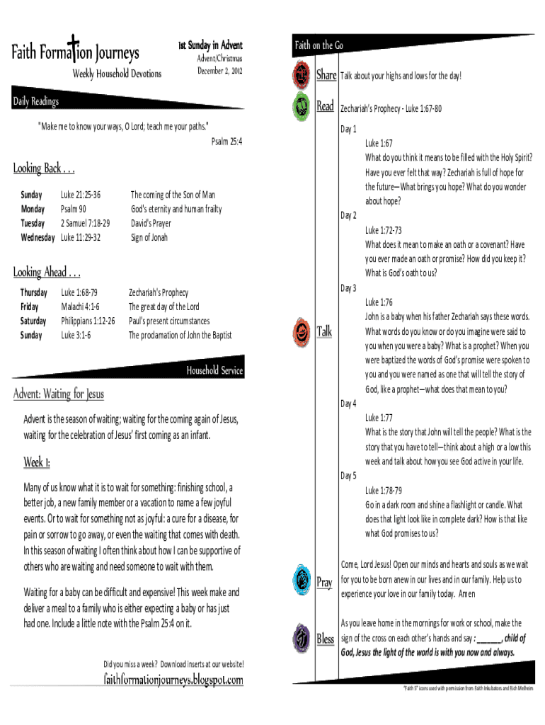 1st Sunday in Advent Weekly Household Devotions Advent/Christmas December 2, 2012Daily Readings Faith on the Gosh are Talkaboutyourhighsandlowsfortheday! Read “Makemetoknowyourways, Lord;teachmeyourpaths.