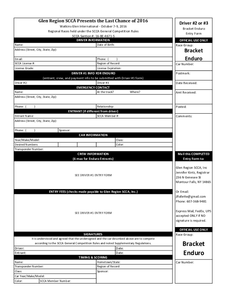 Glen Region CCA Presents the Last Chance of 2016 Watkins Glen International October 79, 2016 Regional Races held under the CCA General Competition Rules CCA Sanction #: 16BE4671S DRIVER INFORMATION