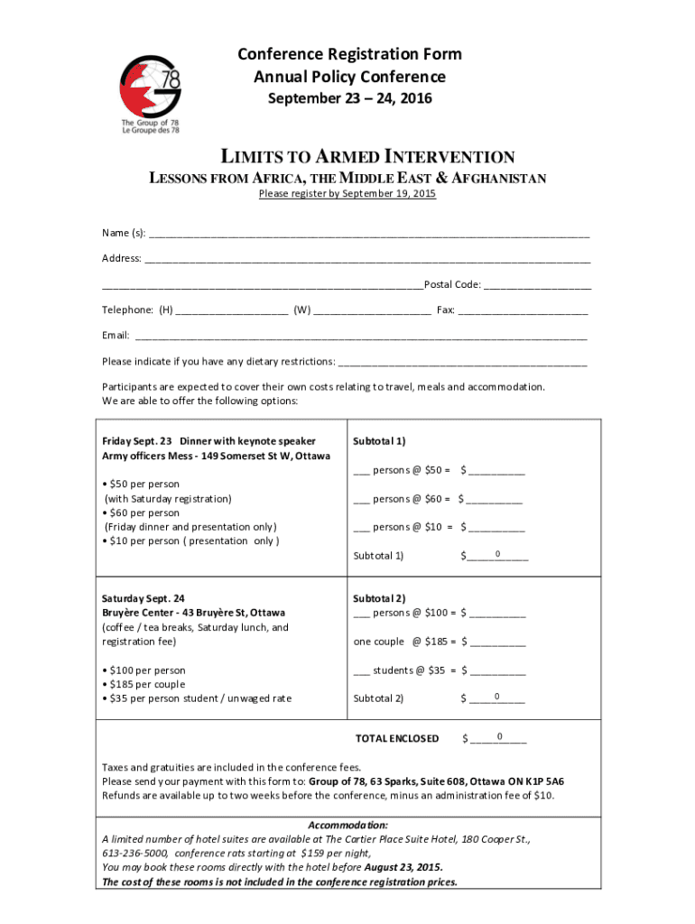 Conference Registration Form Annual Policy Conference September 23 24, 2016LIMITS TO ARMED INTERVENTION LESSONS FROM AFRICA, THE MIDDLE EAST & AFGHANISTAN Please register by September 19, 2015, Name