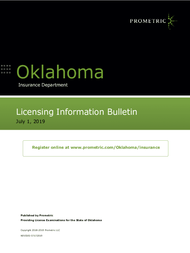 Oklahoma Insurance DepartmentLicensing Information Bulletin July 1, 2019Register online at www.prometric.com/Oklahoma/insurancePublished by Pro metric Providing License Examinations for the State