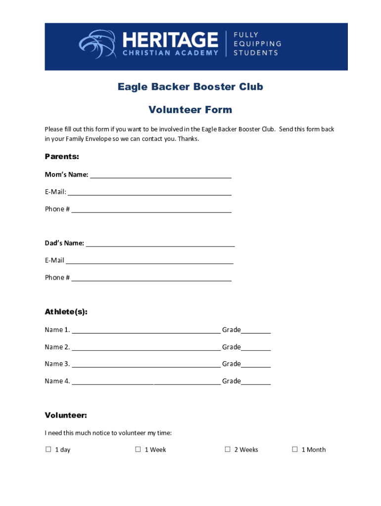 Eagle Backer Booster Club Volunteer Form Please fill out this form if you want to be involved in the Eagle Backer Booster Club. Send this form back in your Family Envelope, so we can contact you.