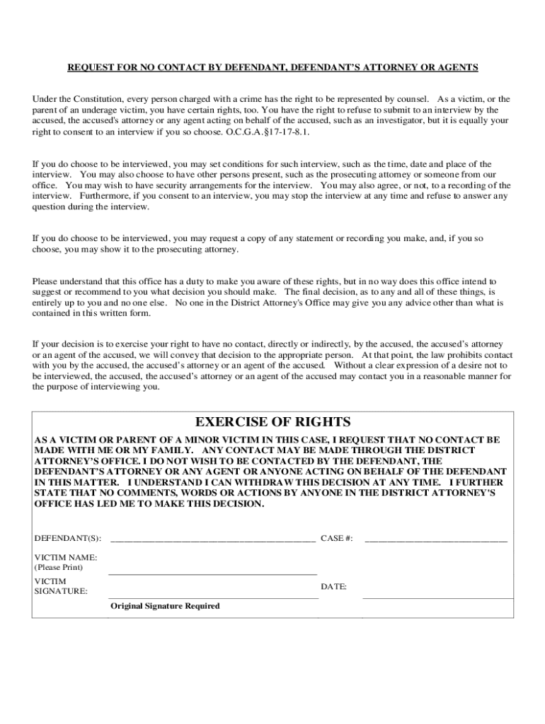 REQUEST FOR NO CONTACT BY DEFENDANT, DEFENDANTS ATTORNEY OR AGENTSUnder the Constitution, every person charged with a crime has the right to be represented by counsel. As a victim, or the