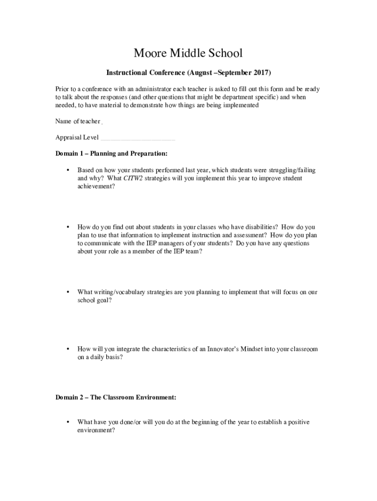 Moore Middle School Instructional Conference (August September 2017) Prior to a conference with an administrator each teacher is asked to fill out this form and be ready to talk about the responses