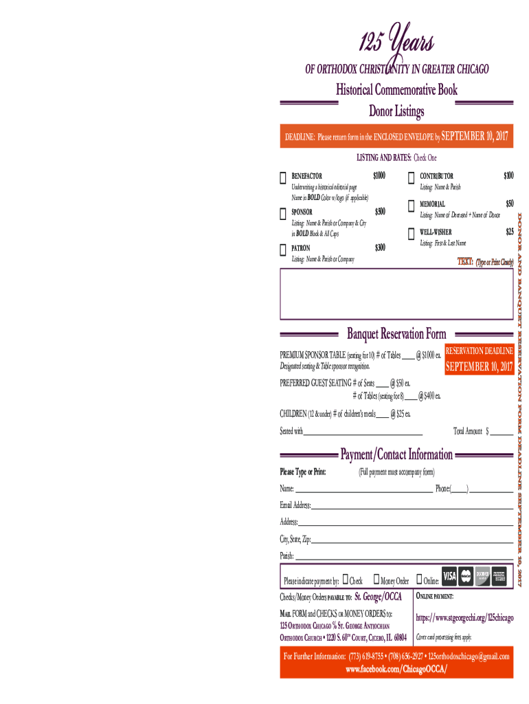 125 Years of orthodox Christianity in greater chicagoHistorical Commemorative Book Donor ListingsDeadline: Please return form in the enclosed envelope by September10, 2017benefactorUnderwriting a