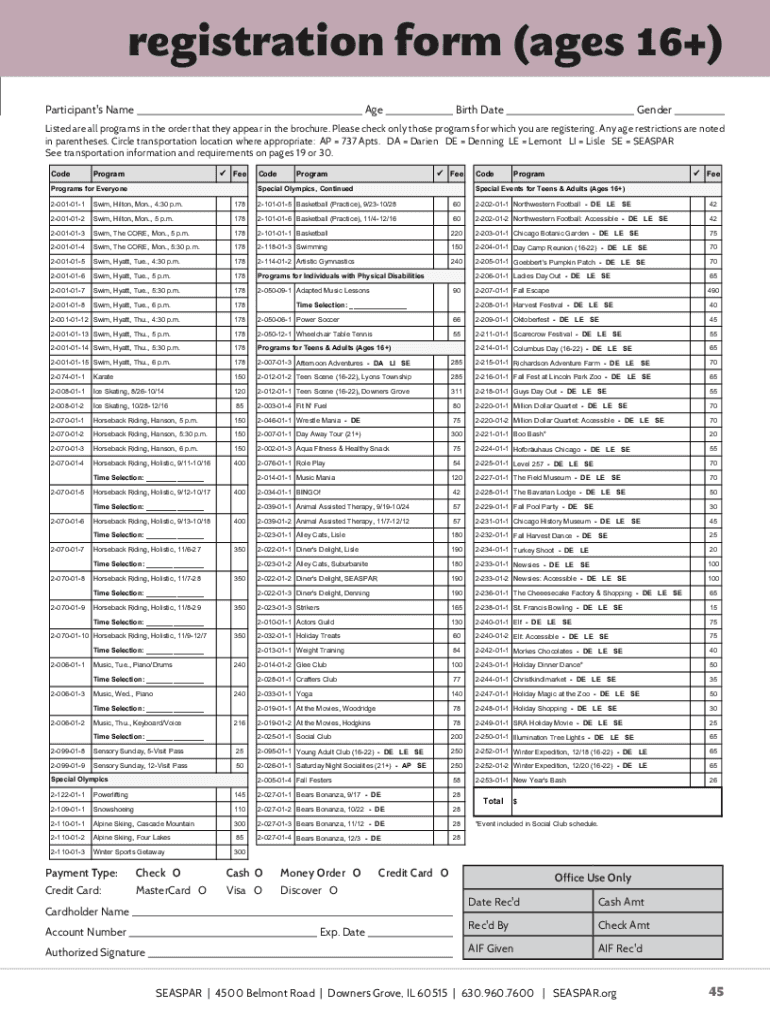 Registration form (ages 16+) Participant's NameAgeBirth DateGenderListed are all programs in the order that they appear in the brochure. Please check only those programs for which you are registering.