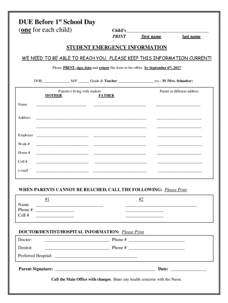DUE Before 1st School Day (one for each child)Child's PRINT first name last nameSTUDENT EMERGENCY INFORMATION WE NEED TO BE ABLE TO REACH YOU. PLEASE KEEP THIS INFORMATION CURRENT! Please PRINT, sign,