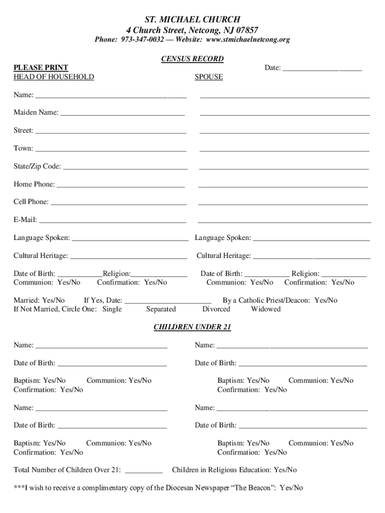 ST. MICHAEL CHURCH 4 Church Street, Netting, NJ 07857 Phone: 9733470032 Website: www.stmichaelnetcong.org CENSUS RECORD PLEASE PRINT HEAD OF HOUSEHOLDDate: SPOUSEName: Maiden Name: Street: Town: State/Zip