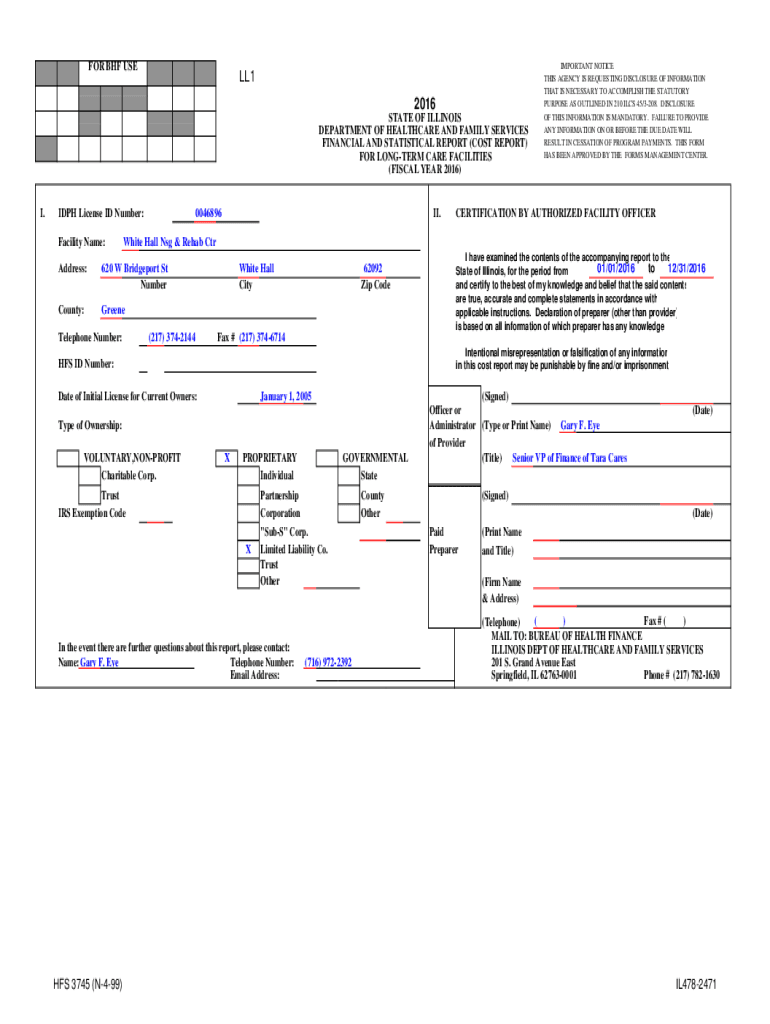 FOR BHF USELL1 2016 STATE OF ILLINOIS DEPARTMENT OF HEALTHCARE AND FAMILY SERVICES FINANCIAL AND STATISTICAL REPORT (COST REPORT) FOR LONGER CARE FACILITIES (FISCAL YEAR 2016)I.DPH License ID Number: