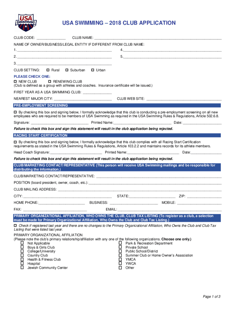 USA SWIMMING 2018 CLUB APPLICATION CLUB CODE: CLUB NAME: NAME OF OWNER/BUSINESS/LEGAL ENTITY IF DIFFERENT FROM CLUB NAME: 1. 4. 2. 5. 3. CLUB SETTING: Rural Suburban UrbanPLEASE CHECK ONE: NEW CLUB