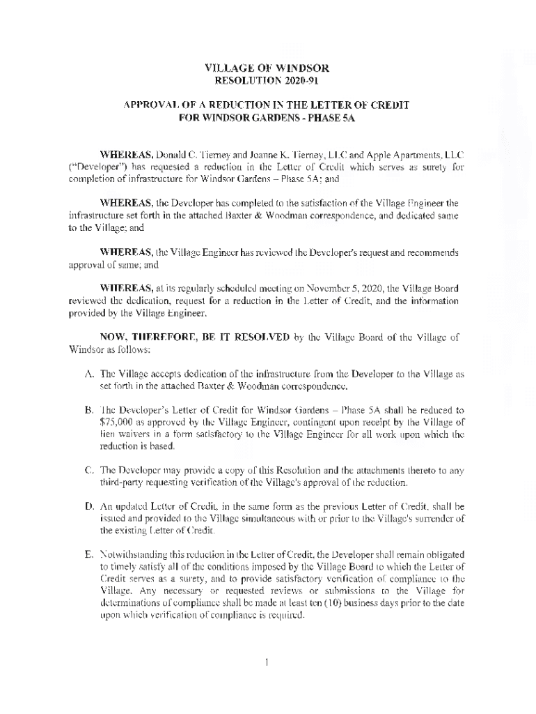 VILLAGE OF WINDSOR RESOLUTION202091APPROVAL OF A REDUCTION IN THE LETTER OF CREDIT FOR WINDSOR GARDENS PHASE 5A WHEREAS, Donald C. Tierney and Joanne K. Tierney, LLC and Apple Apartments, LLC (Developer)