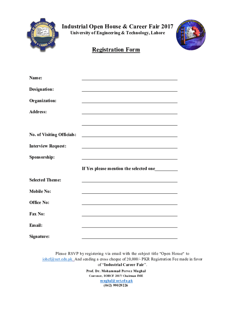 Industrial Open House & Career Fair 2017 University of Engineering & Technology, LahoreRegistration Forename: Designation: Organization: Address: No. of Visiting Officials: Interview Request: Sponsorship: