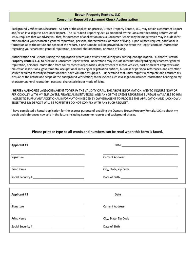 The Consumer Report Authorization Form is a tenant screening document used by landlords to obtain consumer reports as part of the rental application process.