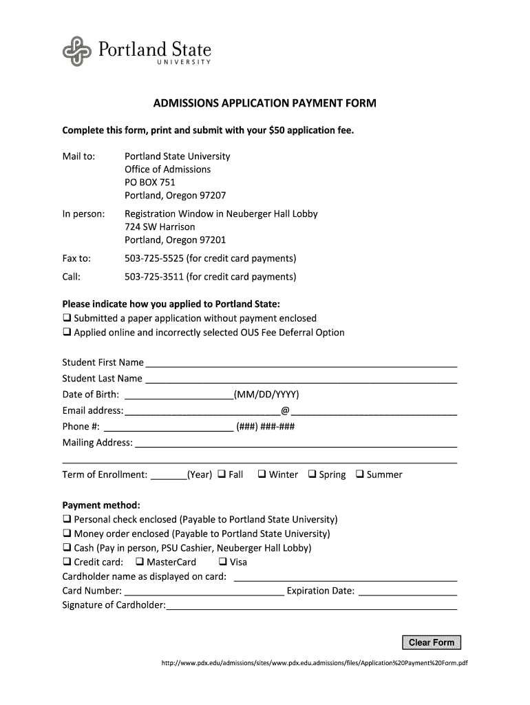 Any student applying to Portland State University is eligible to use the Admissions Application Payment Form to submit their application fee.
