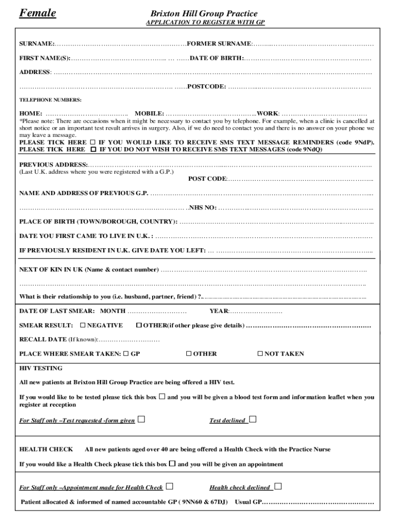 FemaleBrixton Hill Group Practice APPLICATION TO REGISTER WITH SURNAME:FORMER SURNAME:..... FIRST NAME(S):. DATE OF BIRTH:. ADDRESS:.