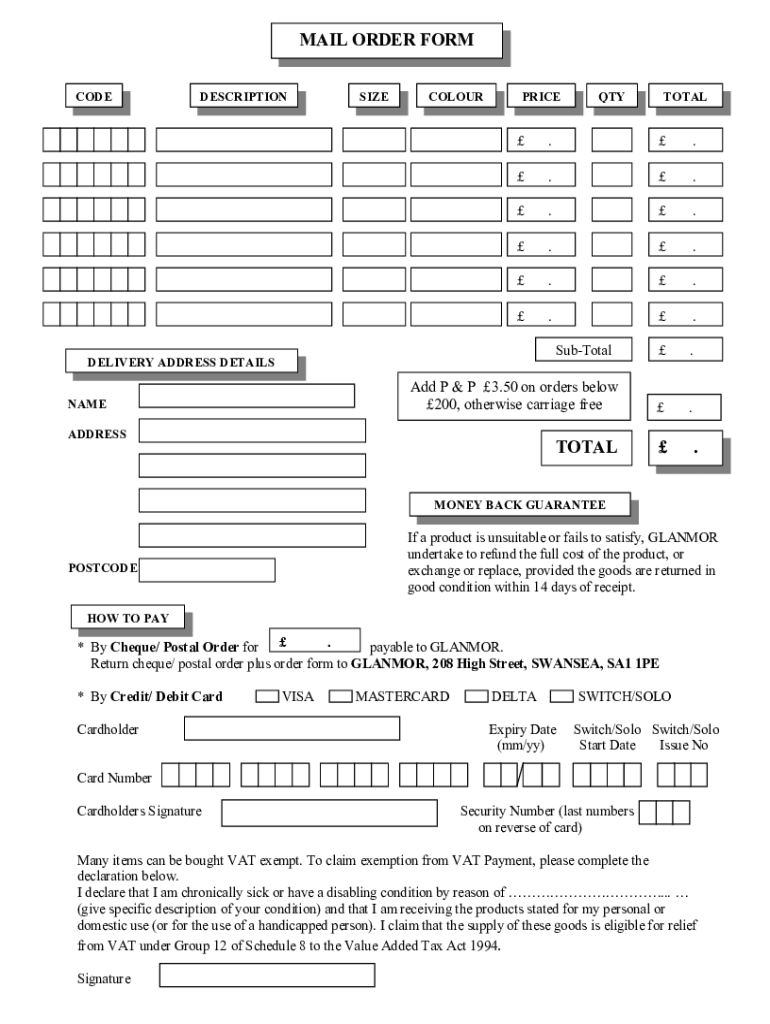 MAIL ORDER FORM CODEDESCRIPTIONSIZECOLOURPRICEQTY............. Add P & P 3.50 on orders below 200, otherwise carriage free.TOTALSubTotalDELIVERY ADDRESS DETAILS NAMETOTALADDRESS.MONEY-BACK Guarantee