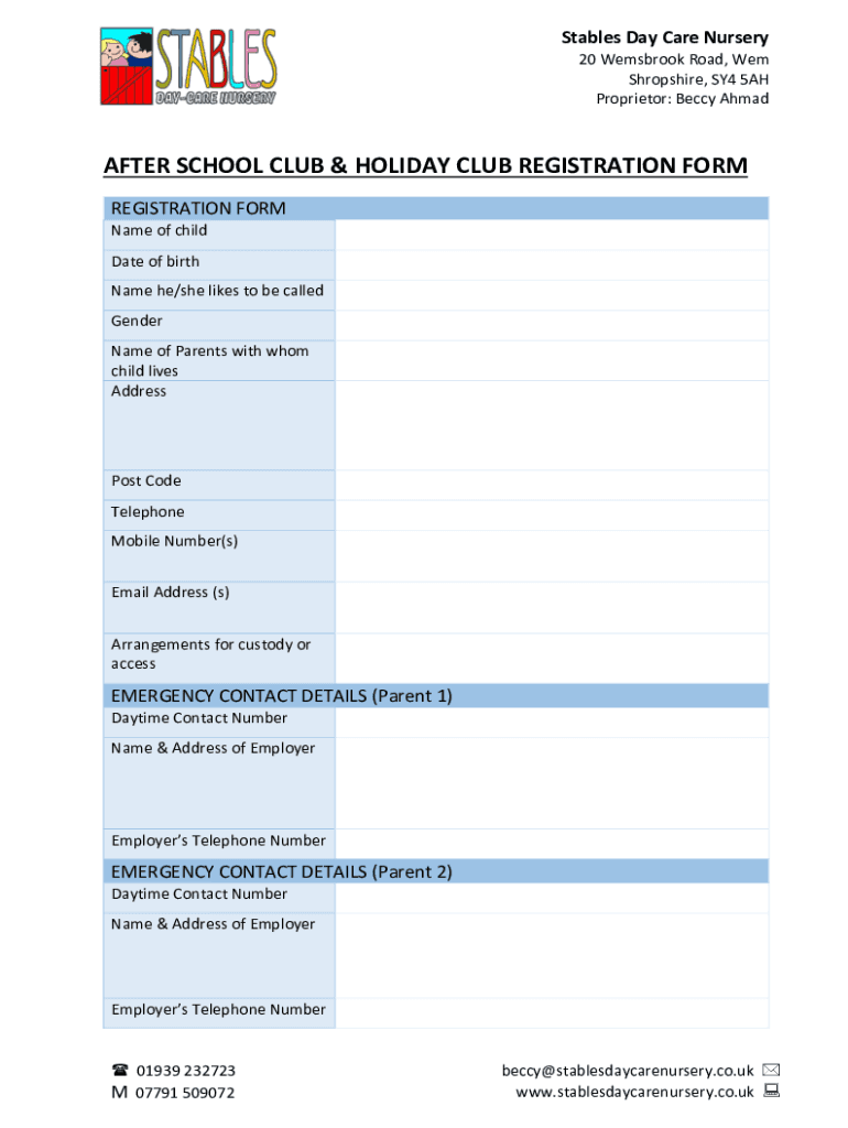 StablesDayCareNursery 20WemsbrookRoad,We Shropshire,SY45AH Proprietor:BeccyAhmadAFTERSCHOOLCLUB&HOLIDAYCLUBREGISTRATIONFORMREGISTRATIONFORM Nameofchild Dateofbirth Name he/shelikestobecalled Gender
