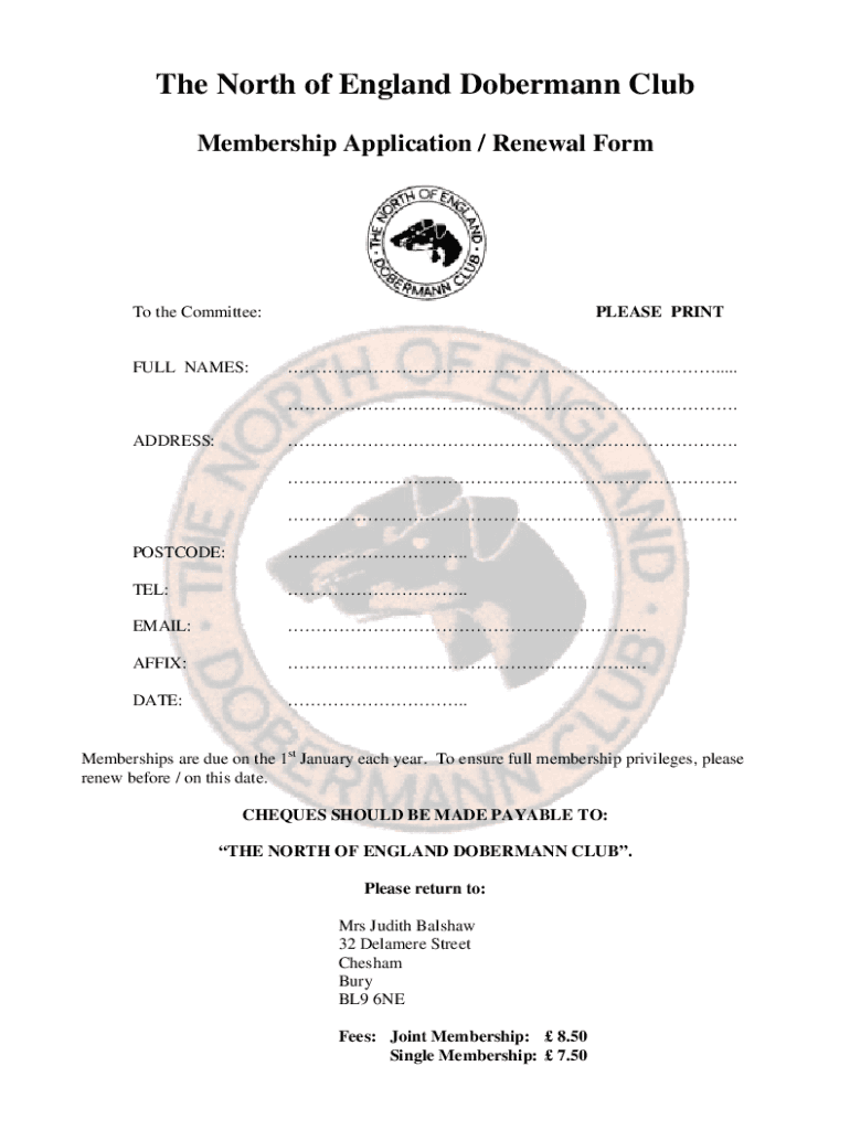 The North of England Doberman Club Membership Application / Renewal Form the Committee:FULL NAMES:PLEASE PRINT......ADDRESS:. .