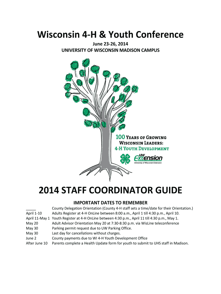 Wisconsin 4H & Youth Conference June 2326, 2014 UNIVERSITY OF WISCONSIN MADISON CAMPUS 2014 STAFF COORDINATOR GUIDE April 110 April 11May 1 May 20 May 30 May 30 June 2 After June 10 IMPORTANT DATES